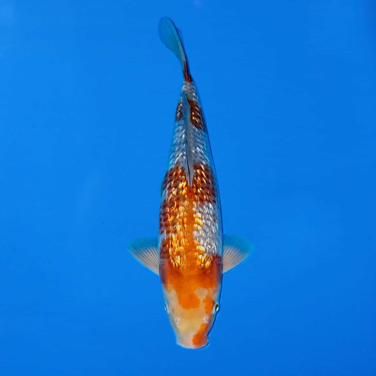 The Gin Rin Ochiba is a striking koi variety known for its special brown or bronze colour, similar to the earthy tones of the Chagoi. This lovely shade is highlighted by soft silvery grey touches like those found on the Soragoi. The name “Ochiba Shigure” means “autumn leaves drifting onto water,” and it brings to mind peaceful scenes of leaves falling onto calm water. Also, as a Gin Rin type, the Gin Rin Ochiba has shiny, metallic scales that catch and reflect light. This creates a stunning look that makes it even more elegant in koi ponds.