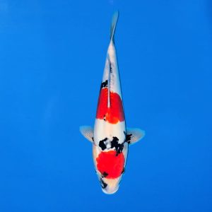 The Kindai Showa variety of koi is known for its clear and bold red (Hi) and black (Sumi) colours. For these colours to look bright and appealing, they must blend well together. A key feature of the Showa pattern is the Sumi marking located near the tail, which helps improve the fish’s overall look. It is crucial for both the Sumi and Hi colours to merge smoothly with a clean white background. The area where these colours touch the white is called the Odome, and it is important for creating balance and beauty in the fish’s appearance.