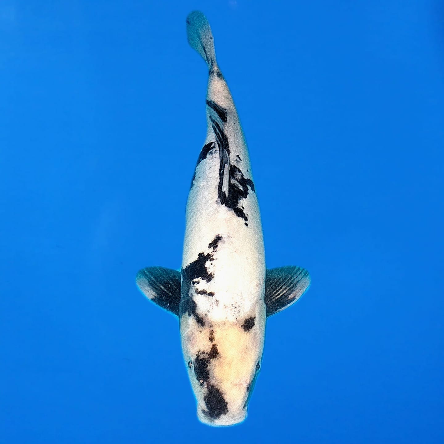 Shiro Utsuri koi, pronounced SHEE-roh OOT-soo-ree, are beautiful fish with a unique colour pattern. They have mostly black bodies (sumi) with striking white patterns (shiro) on their backs. This design looks like a checkerboard, with sections of deep black and bright white. The contrast between the colours makes the koi really stand out. The bright white enhances the artistic look of the fish, which is why many koi lovers and collectors want them. This type of koi shows the skill in koi breeding and the balance between colour and form in these Koi.