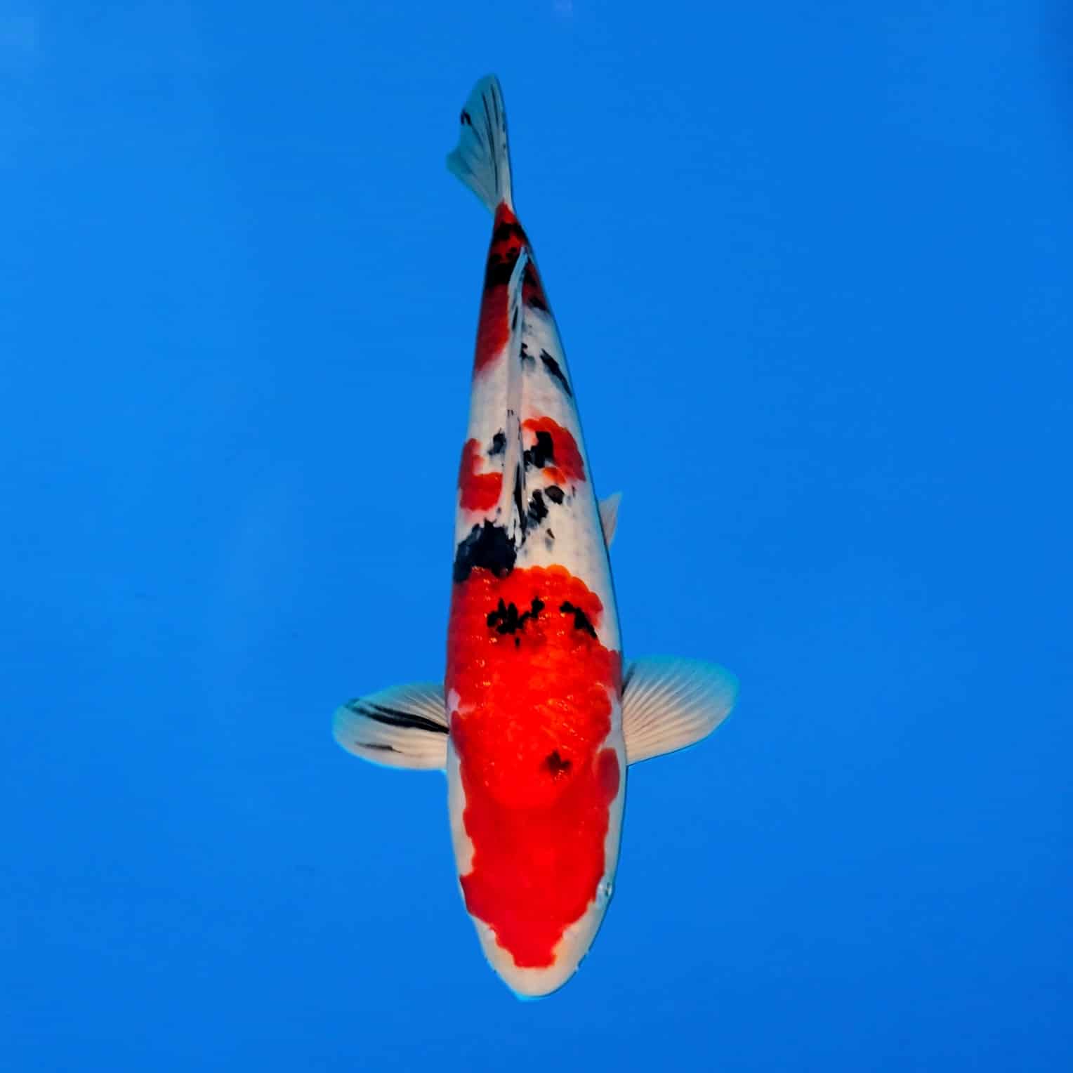 The Sanke, also known as Taisho Sanshoku, is a type of Koi that shows a tri-coloured pattern. It has a white body with red and black markings. This variety first appeared between 1868 and 1912. In 1915, a 15-year-old Sanke Koi was shown at an event, marking its first public display. For Sanke Koi, the white body, or shiroji, must be bright, milky white with no yellow or flaws. The red markings, called hi, should be opaque, consistently coloured, and have sharp edges known as kiwa and sashi. The red can vary from bright orange to dark red. The black markings (sumi) should also be opaque and have well-defined edges. It’s important to note that juvenile Koi may show blue or grey spots that can turn black as they grow older.