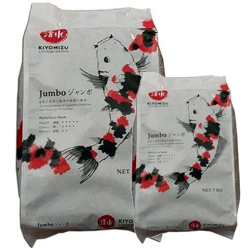 Jumbo Koi need to maintain and improve their body shape and coloration. Giving them large quantities of protein will not help them grow faster, in fact, the opposite is true. Lower quantities of only the highest quality digestible proteins and good support for their health and coloration will make it possible for them to reach their maximum genetic length. They need to get very old and stay healthy. Kiyomizu Jumbo will do exactly that, thanks to special ingredients to improve health, water quality and promote a long life.