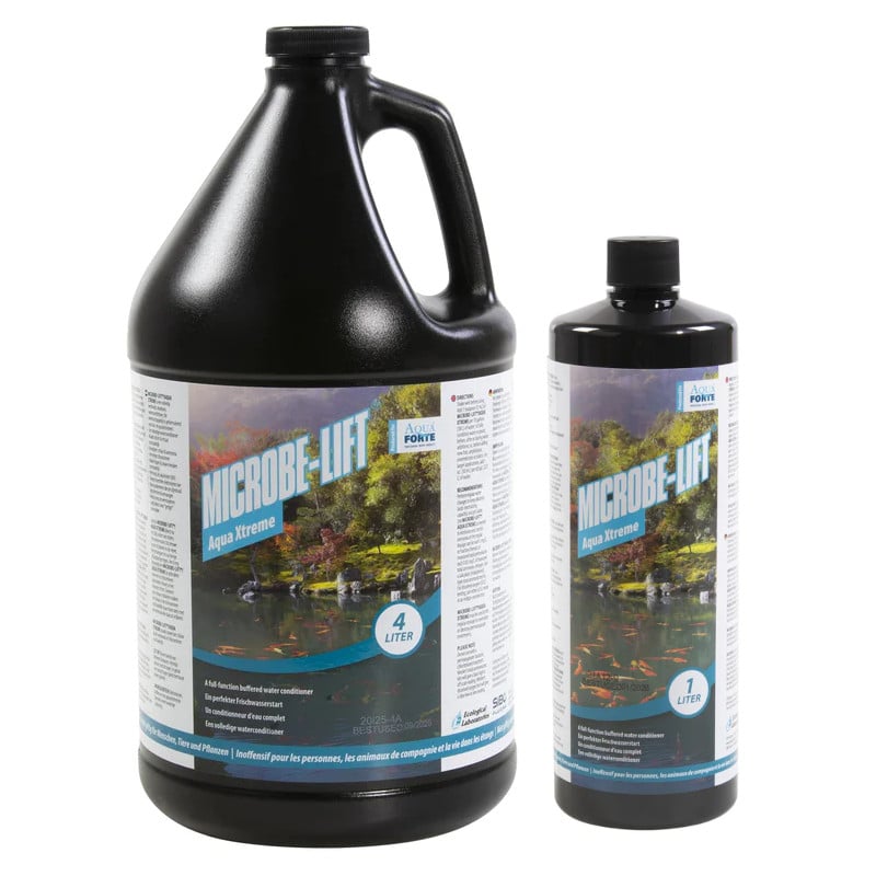 Microbe-Lift AQUA XTREME is a convenient liquid, single-phase, full-function water conditioner that has been scientifically formulated for use in koi and goldfish ponds. Microbe-Lift/AQUA XTREME should be used when: conditioning new water for ponds; adding (or prior to adding) water, new fish or plants to ponds; and transporting koi and goldfish. It is very important to use Microbe-Lift AQUA XTREME when adding water to a pond that contains chloramines. Conventional dechlorinators will detoxify the chlorine in the chloramines but do nothing to the ammonia released from the chloramines. Microbe-Lift/AQUA XTREME will detoxify both the chlorine and the ammonia in chloramines.