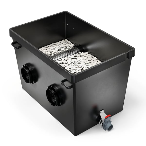 The XL Moving Bed Module feature 2 x 180mm inlets (from Drum Filter exit) and 2 x 180mm outlets (for connection to the Discharge Module or an additional Moving Bed Module). The Module is fitted with a porous aeration bar which, when connected to a suitable Air Pump, will provide oxygen enrichment and movement to increase aerobic bacterial growth on the pond pads