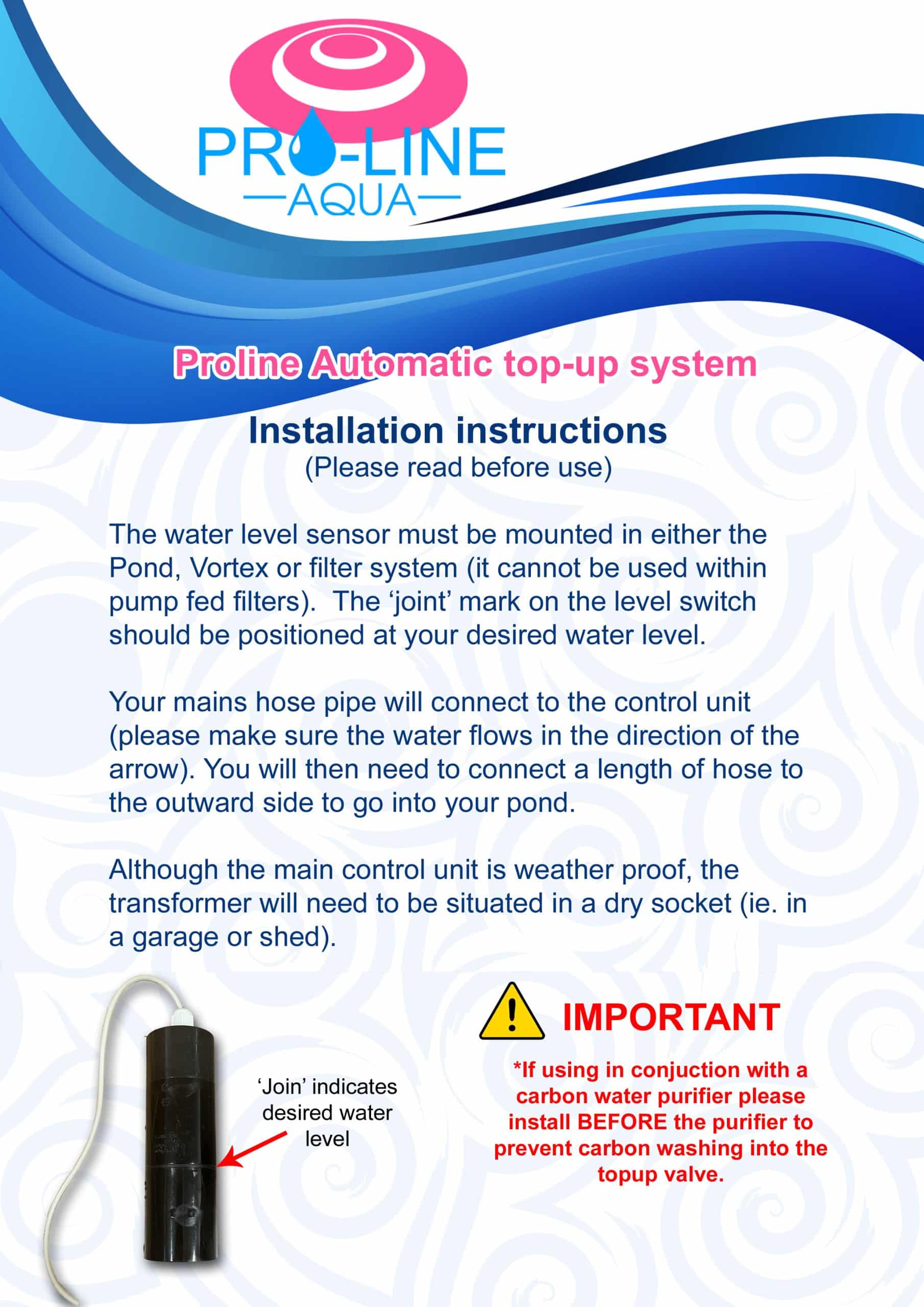 The Pro-Line Aqua Auto Top-up system is installed with a simple float mechanism with waterline mark. When the water level in your pond drops below the set level the unit will let mains water through and continue to fill the pond until the water level is back up to the desired set point.